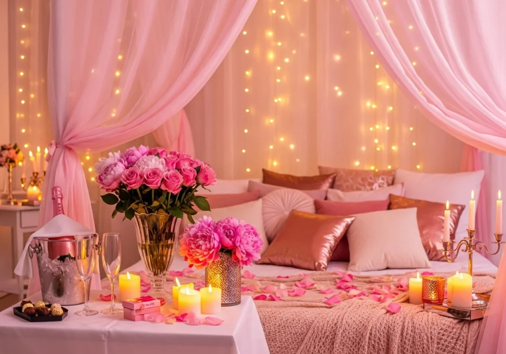 Start by cleaning the room completely. Choose a soft color theme, then add rose petals, candles, fairy lights, and fresh flowers. Keep the bed as the main focal point and avoid overcrowding the space.